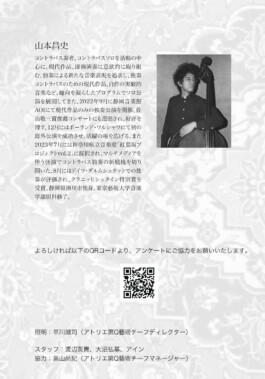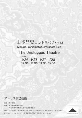 会場となる『アトリエ第Q藝術』は、多様な表現芸術を発信する実験的で自由な空間である。コントラバスという楽器の特徴を最大限に生かした現代作品の数々に、第Q藝術チーフディレクター・早川誠司氏の照明演出も加わり、前代未聞の三日間となることだろう。