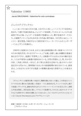 1969年に初演されて以来、世界中で最も演奏回数が多いと思われる独奏コントラバスのための現代作品。演奏者は弓、両方の手、ティンパニのスティックで楽器胴体、駒、弦を叩き、多彩なビートと音色が生み出される。セリフを読んだり、絶叫したり、また、歌による対位法もある。 「ヴァレンタインは強烈な勢いで始まり、陶酔状態に向かって進む。演奏者は、ほぼマルキ・ド・ サドのような集中力で、楽器を攻撃しなくてはならない。」(スコア冒頭より)
