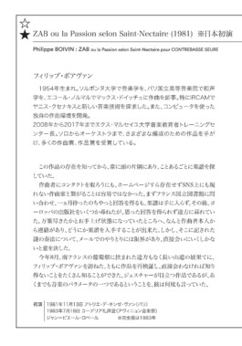 演奏者は単に楽器を奏でるのではなく、楽器を扱う一つ一つの動作や声や息づかいまでも用い、コントラバスに楽器以上の役割を与える。その難易度から過去演奏した奏者は2人だけ。何十年もの間、埋もれた 名作として存在していた。 ボアヴァンはIRCAM創設初期にクセナキスらと電子音楽の研究もしており、その時期に書かれた『ZAB』 は完全にアコースティックであるが、実に挑戦的で実験的な作品となっている。この作品を復活させるべく、 今年の夏、作曲者の元を訪ね、ともに再検証を図った。