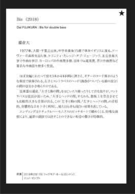 Using a special tuning, the double bass is strummed like a guitar throughout the entire piece. Stringed instruments usually produce a sound by pronouncing the strings from the ‘pressing point’, but because the double bass has long strings, it can produce a loud sound even if the strings are pronounced from the ‘pressing point to the upper bridge’, in other words, on the fingerboard. This work can be said to have established a new method of playing the double bass, making good use of the pitch and acoustic difference between the ‘piece to string pressing point’ and the ‘string pressing point to upper part’.