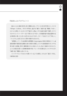 Ninth in a series of works using two tanka poems by Kenji Miyazawa. The piece will be in the form of a performance and talk. Mr Kinoshita and I have been to many of each other's concerts and have premiered several of his solo pieces. We also performed together in July this year. He is without doubt the composer who has heard me play the most. I am convinced that this will be a unique work.